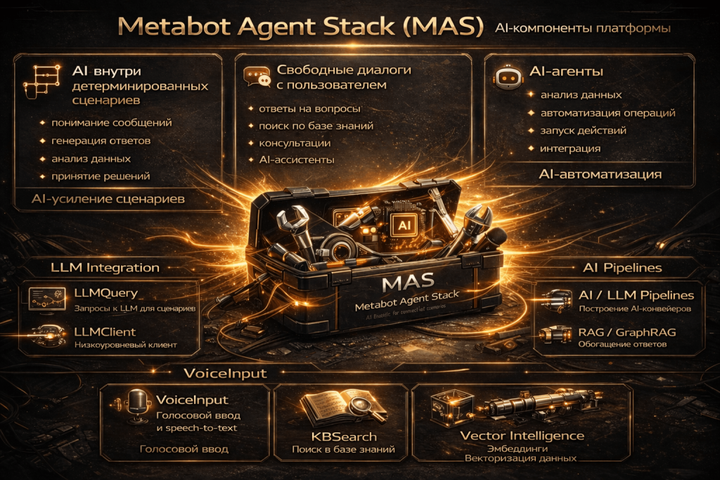 Metabot Agent Stack (MAS) — это набор AI-компонентов платформы Metabot, который позволяет встраивать искусственный интеллект внутрь сценариев, диалогов и бизнес-процессов.